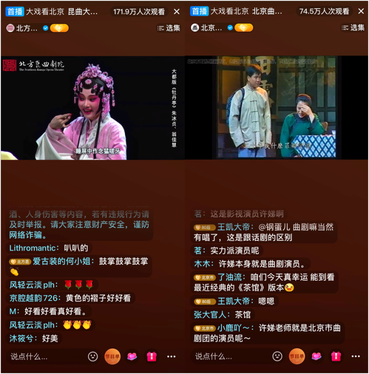 昆曲《牡丹亭》、评剧《花为媒》、评剧《杨三姐告状》等传统戏曲经典剧目,也都受到了不少戏迷的喜欢,平均单场观看人次超过200万。有观众人评论“没想到昆曲都能有这么多观众喜欢”,有人表示“这是观众之幸,昆曲之福”。